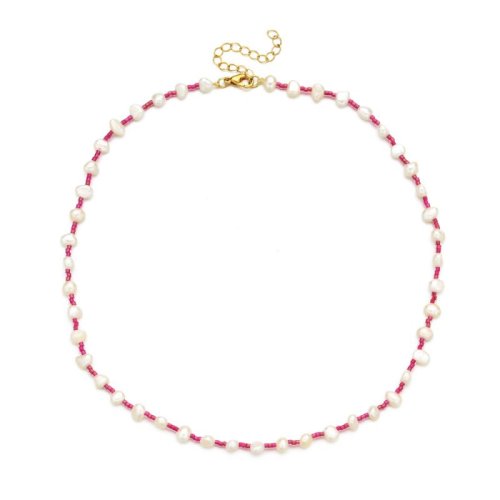 Jemný náhrdelník s neonově růžovými rokajlovými korálky a přírodními říčními perlami.